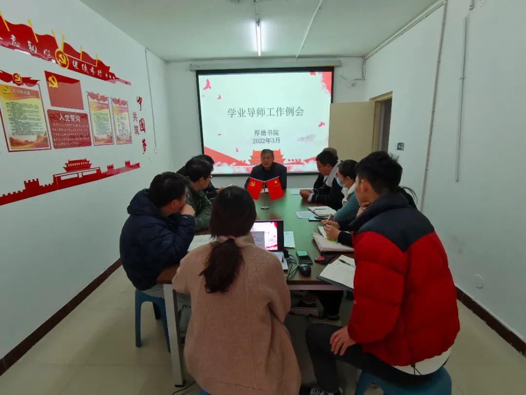 2022年3月3日下午4:30厚德书院于文九111召开新学期学业导师工作例会。段维峰院长、闫冰冰老师、厚德书院各学业导师出席并参加此次会议。