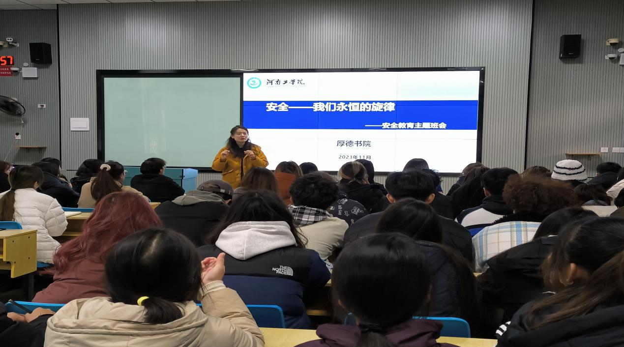 为了进一步普及安全知识,提高书院学生的安全防范和自我保护意识,厚德书院于2023年11月30日,由党总支书记司尧华、院长陈新亚、辅导员闫冰冰、牛伟明为书院学生开展了以“安全——我们永恒的旋律”为主题的安全教育班会。