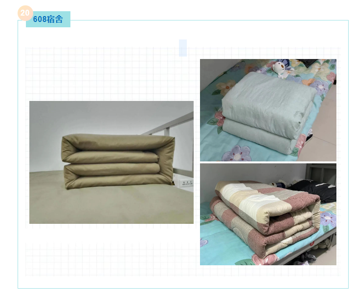 方寸之间,丈量的是细致严谨;平竖之间,展现的是务实力行。“叠被子大赛”简而不凡,从日常生活的点滴做起,以良好的风貌去开启大学生活,养成良好的生活习惯,提高自律性,并持之以恒。大事必作于细,一床小小的被子,不仅能锻炼出同学们严谨的作风,更能体现我院学生昂扬向上的精神风貌。书院通过发布公众号,组织线上投票的方式,秉着“公平、公正、公开”的原则,让更多的人参与其中,将良好的生活习惯传递给他人。