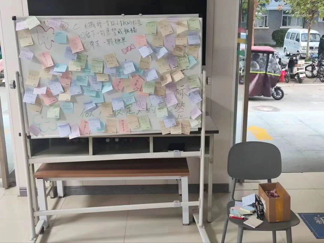 同学们写在黑板上的标签放置于书院门口,让标签中的焦虑随风消散。“生年不满百,常怀千岁忧。”人的一生,每天都会遭遇无数难题。事事烦恼,既解决不了任何问题,还会让自己陷入自我怀疑、焦虑,过度焦虑将是我们前进道路上的绊脚石,它会影响我们的办事效率,让我们所有的努力大打折扣,甚至付诸东流。因此拒绝焦虑,别让焦虑成为生活的阻碍!