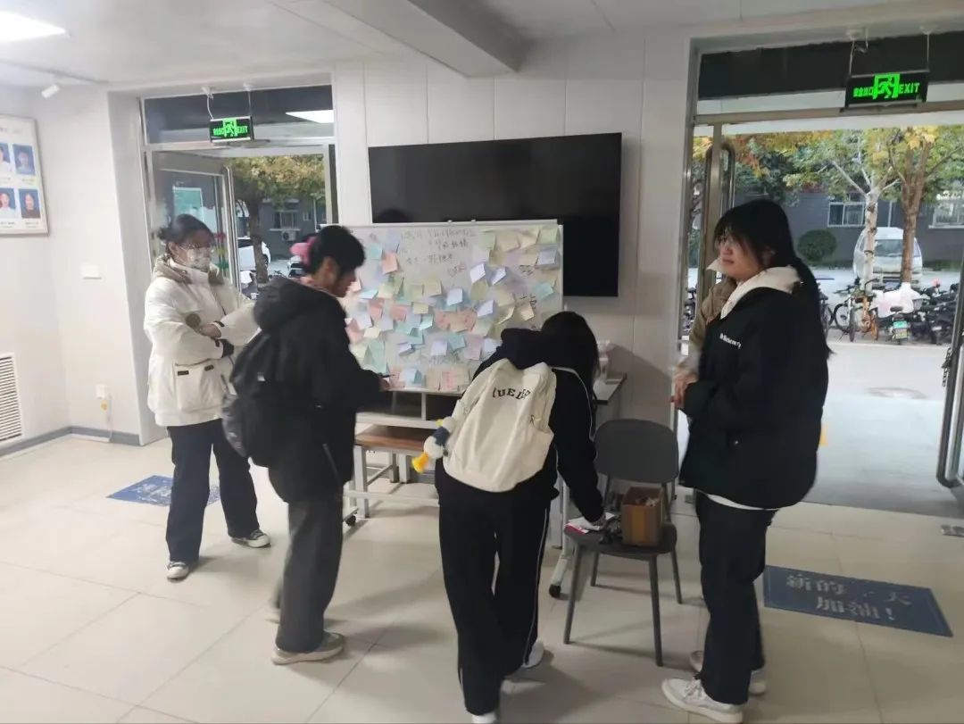 在活动现场,活动负责人提前准备好了便签,同学们热情高涨,活动开始后,同学们积极的在便签上写下自己的烦恼、祝福与愿望,将其贴在黑板上,从这些标签中我们可以看出大家对生活乐观的态度,这些“爱”的标签也在不断地让焦虑的人从焦虑中慢慢走出来,被爱一点点温柔着。