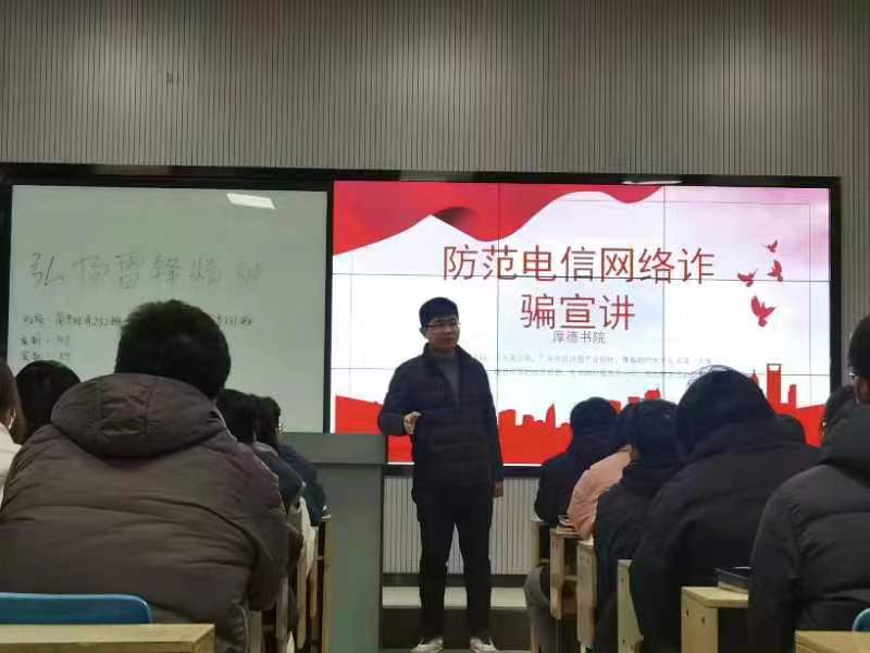 随着互联网、通信网络不断发展,不法分子利用现代通信技术和网络结算方式实施诈骗的犯罪活动日益猖獗。为进一步提高厚德学子安全防范意识,预防和减少校园网络电信诈骗的事故发生。3月7日午,厚德书院于教一开展防范电信网络诈骗宣讲专题班会,班会由闫冰冰老师、牛伟明老师主持。