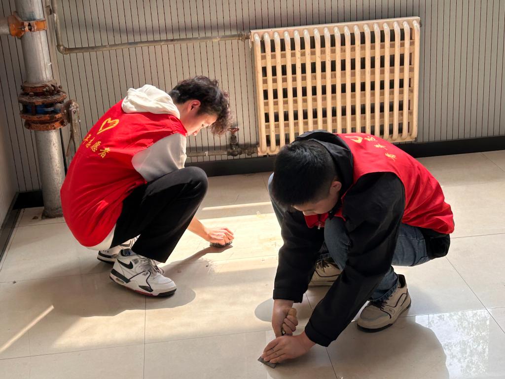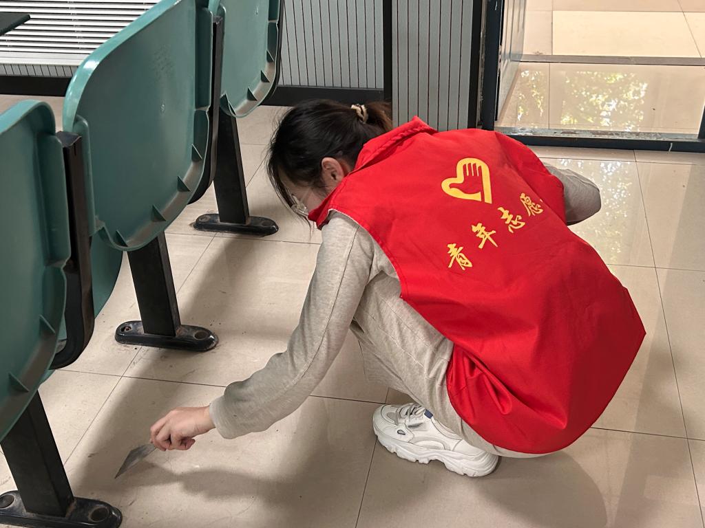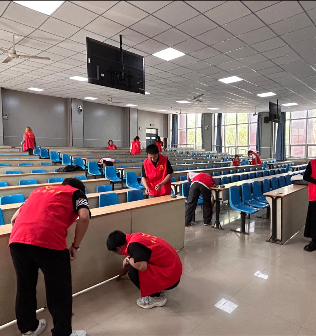 在本次教室卫生打扫中,每位志愿者都充分发挥吃苦耐劳的精神,肩负起教室的卫生工作。手持铲子和钢丝球,一丝不苟地清扫每一个角落,铲除所有在地板上的黑点,将桌椅擦得一尘不染,黑板上的字迹也被擦拭得干干净净,用实际行动为创建干净、整洁、文明的校园环境以及更好地迎接本科教育教学评估工作贡献了自己的一份力量。