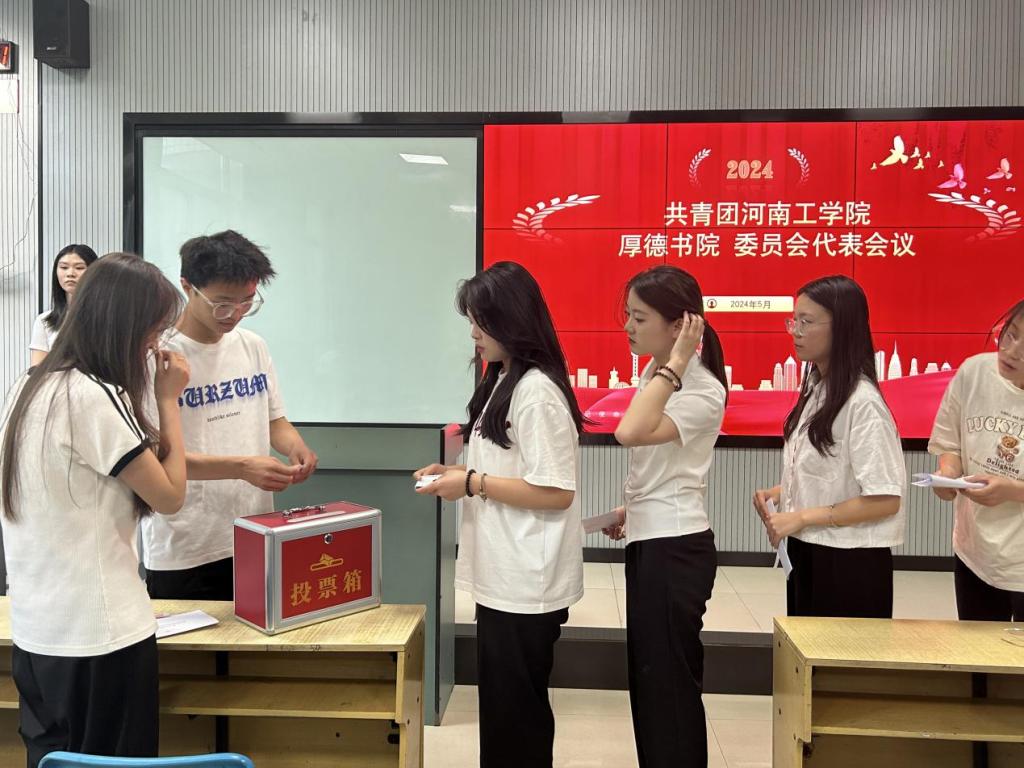 为了推动书院工作开展,加强队伍建设,选拔一批品学兼优、责任心强、有较强组织能力的学生代表,2024年5月16日在教学一楼B105召开共青团河南工学院厚德书院学生代表大会,书院辅导员闫冰冰、牛伟明以及学生代表参加了本次会议。