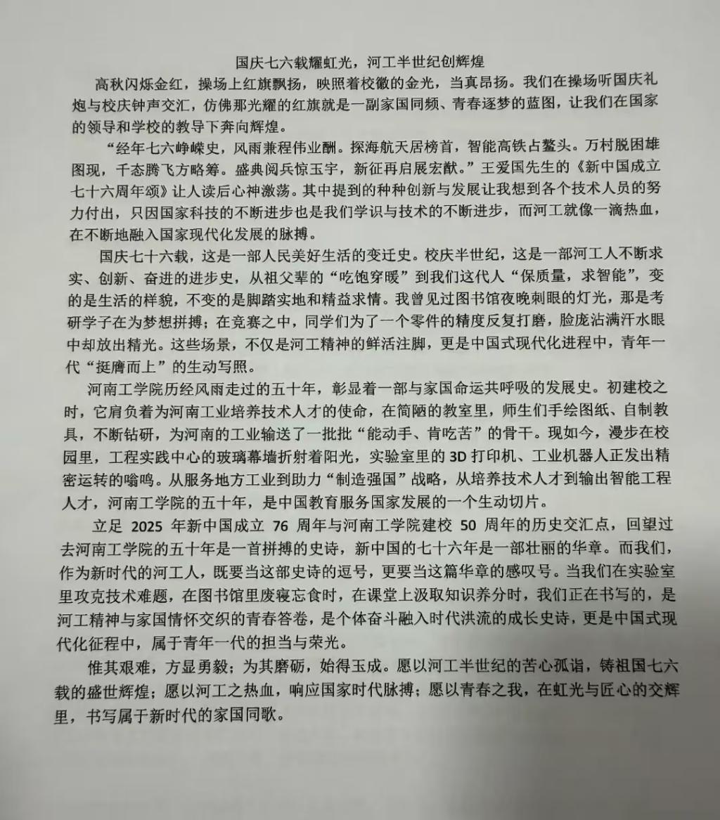 为热烈庆祝新中国华诞与河南工学院建校五十周年,厚植学子家国情怀与爱校荣校意识,厚德书院于10月1日到10月9日举办“国庆荣光耀华夏,河工五十铸辉煌”征文比赛。此次比赛以文为媒,搭建起学子抒发心声的平台,让大家在笔墨间传递对祖国、对母校的赤诚与热爱。