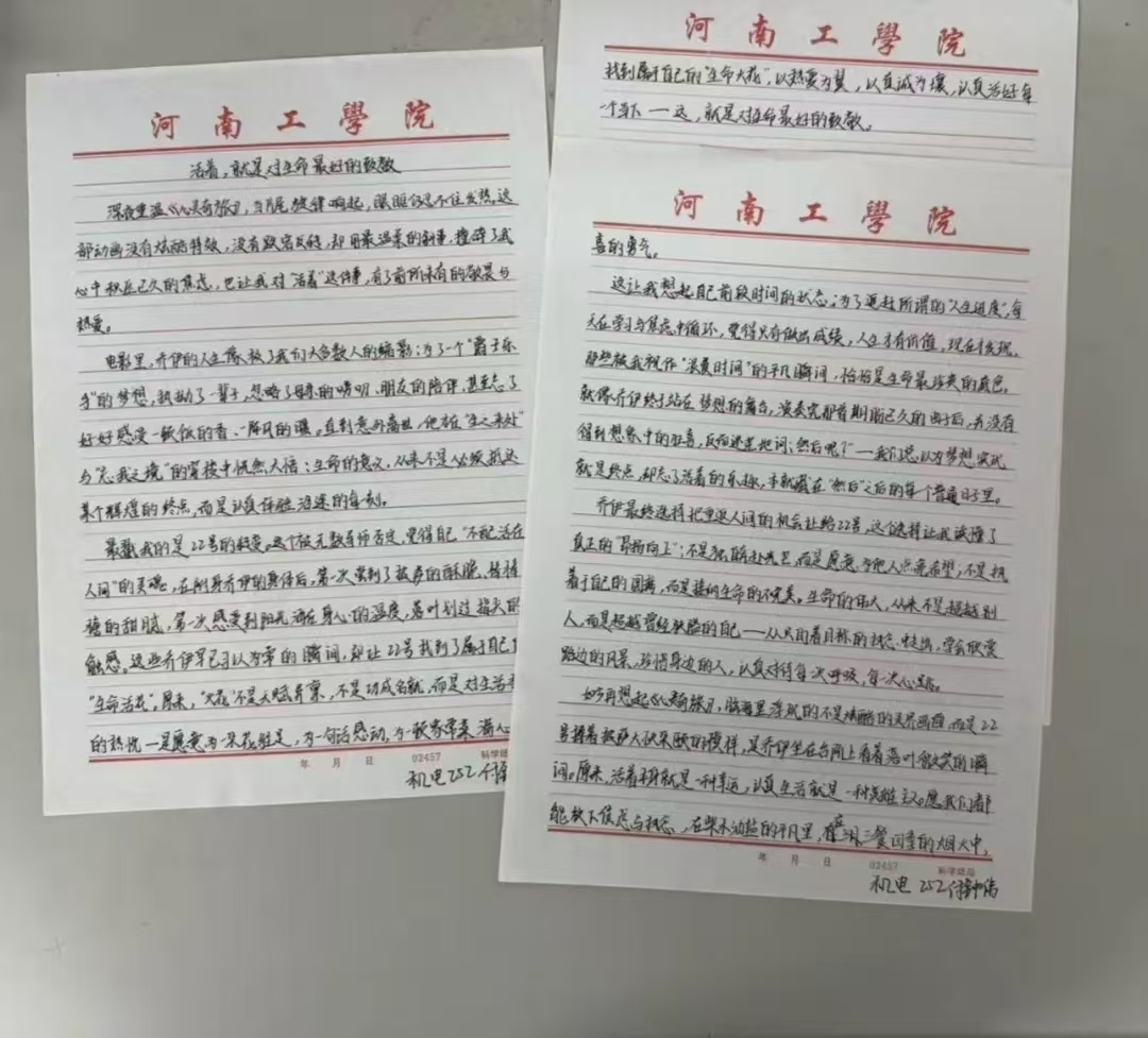 活动因主题治愈力与形式创新性广受青睐,影片聚焦生命意义与自我和解的深刻议题,易引发青年共鸣,“观影+征文”模式既提供沉浸式体验,又给予情感抒发出口。厚德学子积极参与,结合自身经历撰写的多篇作品饱含真情、见解独到。经线下学生评委团严格筛选,机械电子251唐依平、机械电子252付钟伟等学子凭借出色作品脱颖而出。