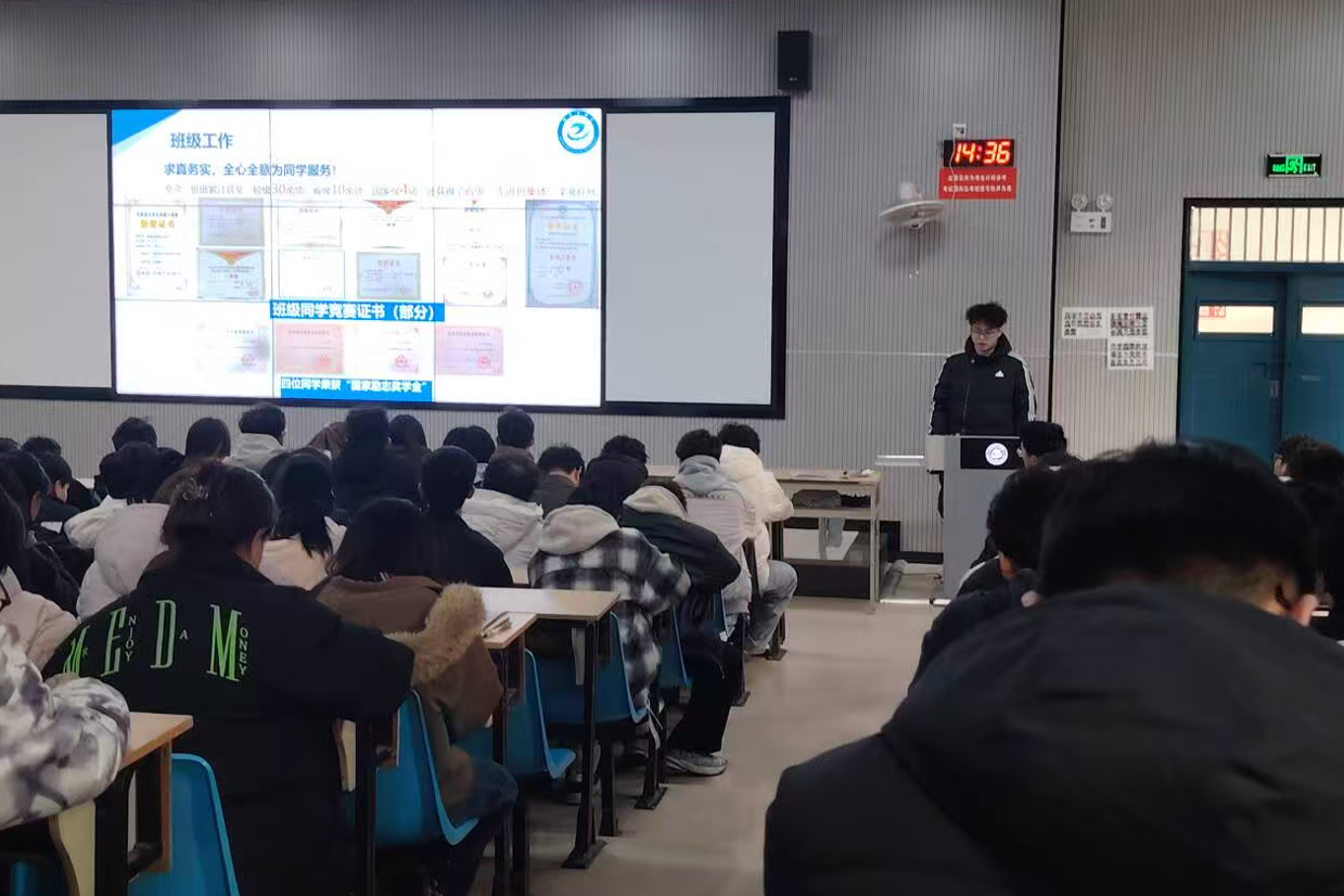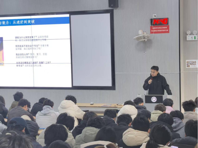 仪式现场,浓厚的学习氛围与积极向上的精神风貌相得益彰。在核心环节“优秀学子经验分享”中,国家奖学金获得者刘青峰、吴迪两位同学作为优秀学生代表登台发言,用真实经历与成长感悟为在场同学提供了可借鉴、可复制的学习范本。刘青峰同学围绕“专业学习与科研训练的协同推进” 展开分享,他结合自身参与省级大学生创新创业项目的经历,详细介绍了如何平衡课堂学习与科研实践,从 “明确研究方向”“组建协作团队” 到 “攻克技术难题”,每一个环节都凝聚着他对学术探索的执着与思考。随后,吴迪同学以 “自我管理与目标实现” 为主题,分享了自己的学习方法与时间规划技巧。