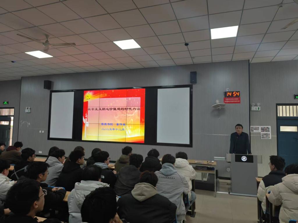 为深入学习贯彻社会主义核心价值观,引导师生将价值追求融入学习工作与成长实践,12月11日下午,厚德书院在教一C108举办社会主义核心价值观大讲堂活动。书院院长董作霖担任主讲人,全体教职工及2025级学生代表参加了本次活动,共同感悟核心价值观的深刻内涵与时代意义。